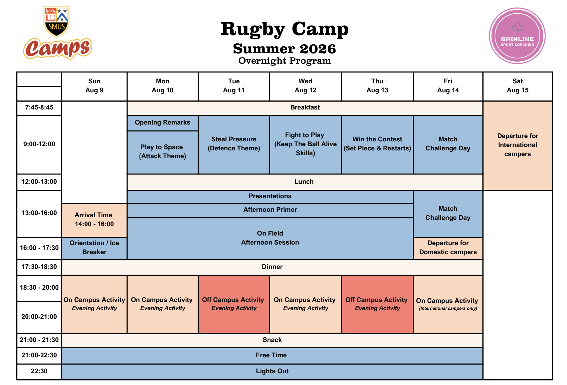 University Prep: Because it is an overnight camp using SMUS boarding facilities, it mimics a university varsity environment. Players manage their own schedules, recovery, and meals.